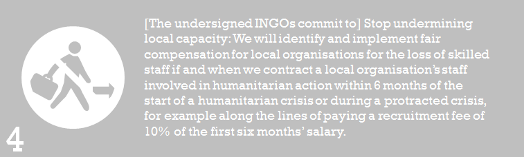 This paradox must be addressed if change is to be achieved. This isn’t to say that INGOs and UN agencies must immediately stop hiring local staff, which would be equally as undesirable as it would be impractical, but a mechanism that prevents or mitigates this loss in capacity is sorely needed.
